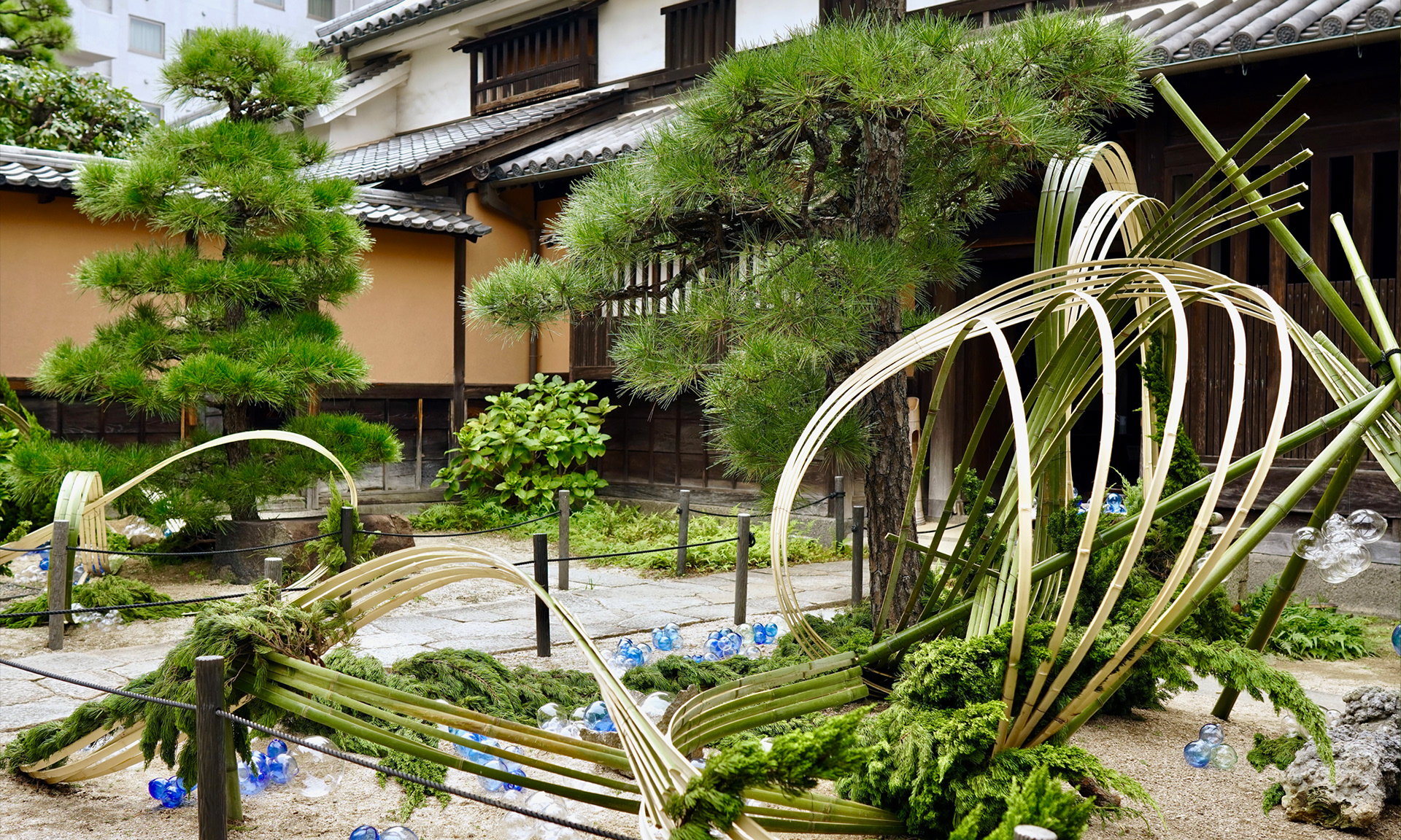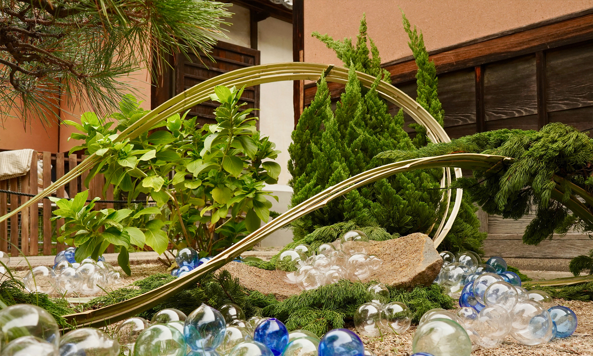 Cultural Exchange Event at the Historic Ohashi House Centered at the Ohashi House—a traditional merchant residence built in the mid-Edo period—this cultural exchange event connects local shops along the historic Achi-machi Street, showcasing a curated selection of locally sourced food, crafts, and art. I was responsible for the botanical installation around the pine tree at the venue’s entrance. The design features locally gathered bamboo and Kaizuka juniper branches. In collaboration with glass art students from Kurashiki University of Science and the Arts, the installation expresses the serene waterscape of the Takahashi River.